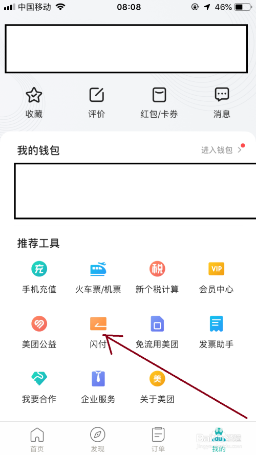 打开美团显示我的选项界面中在保举东西栏中点击“闪付”选项。
