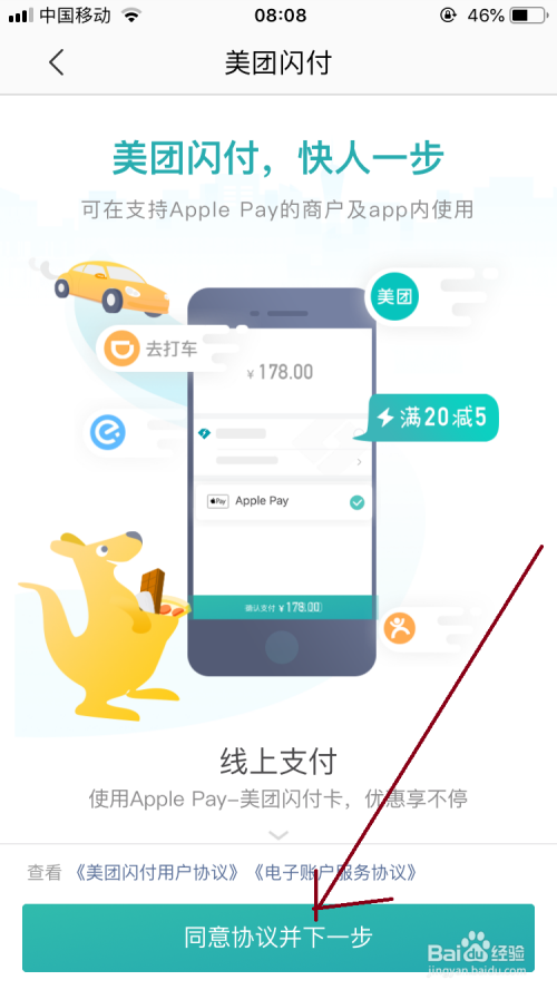 然后打开美闪付的界面中点击“赞成和谈并下一步”按钮。