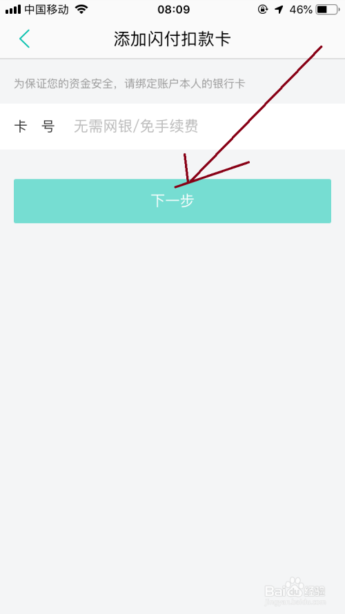 然后打开添加闪付扣条目卡的界面中输入银行卡的编号再点击“下一步”按钮。