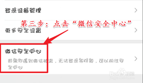 进入“账号和平安”功能界面今后。点击界面最下方的“微信平安中间”功能。