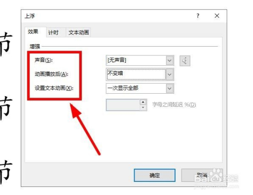 在这个对话框中还可以设置动画播放时的声音,动画呈现后的颜色,等等。