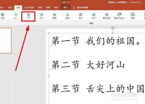 选中文本框,上面的东西栏会动画的各类体例和路径,随便选择一种,我们选择”浮入“。