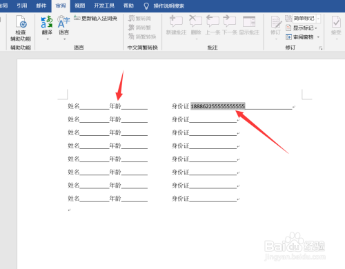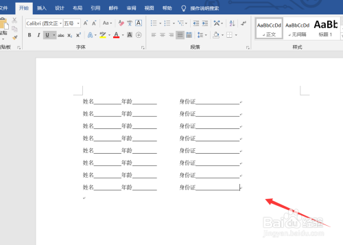 首先我们打开word软件,新建一个空白页面,在页面中输入一些姓名,春秋,身份证等。