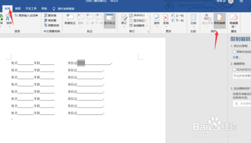 然后我们回到本家儿页面,点击上方的核阅,选择限制编纂,进入限制编纂页面。