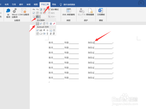 接着我们进入开辟东西那一栏,将其放在身份证后面,然后点击上方的就是窗体选择内容控件。