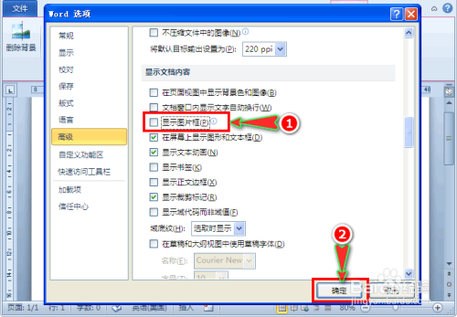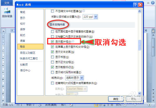 在右侧的具体内容中,我们往下翻动找到“显示文档内容”子项,并在其扩展项中打消“显示图片框”的勾选,再点击“确定”按钮。如图所示: