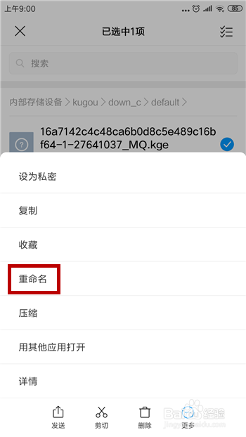 找到缓存文件后长按这个文件并点击【重定名】选项。