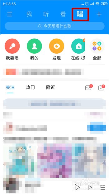 我们打开酷狗音乐后点击顶部的【唱】,然后去搜刮要K歌的歌曲。