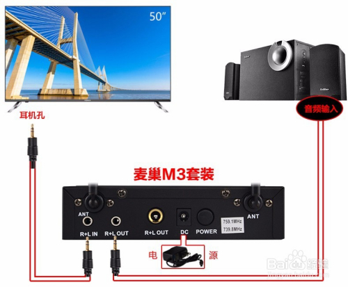 用1分1音频线,此中一端接电视音频输出孔,别的那端接话筒本家儿机IN输入接口