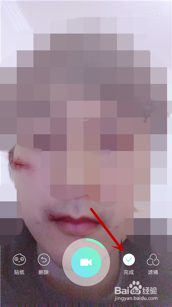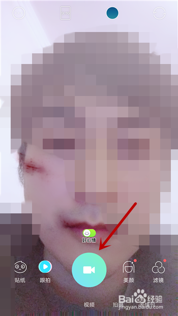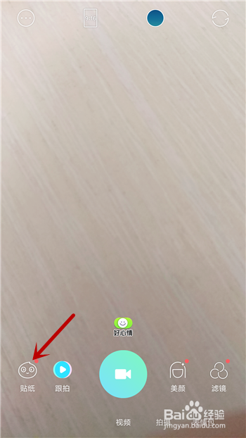 切换到拍摄视频界面后点击左下角的【贴纸】。