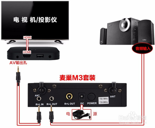 用1对1音频线,此中一端接小米盒子AV输出孔,别的一端接话筒本家儿机R+L IN输入插孔