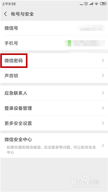 想要点窜密码,在账号与平安界面中点击【微信密码】选项。