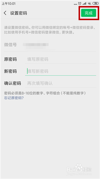 进入到点窜界面后需要输入本来的密码以及新设定的密码,点击右上角的【完当作】即可点窜当作功。