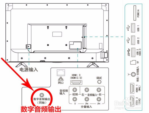 同轴线一端接电视数字音频输出孔,别的一端接转换器INPUT同轴输入孔