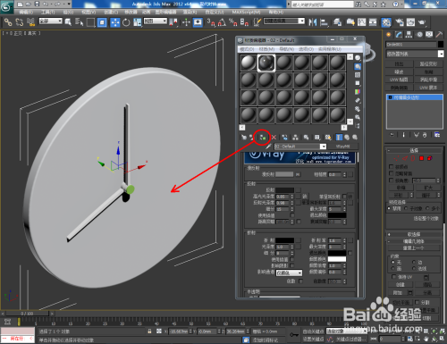 点击【材质编纂器】,按图示设置一个大理石材质球和一个金属材质球。将大理石材质附加给时钟面,并为其添加UVW贴图。将金属材质附加给指针,完当作整个时钟模子的建造。最后,点击【衬着】将建造好的时钟模子衬着出图即可。