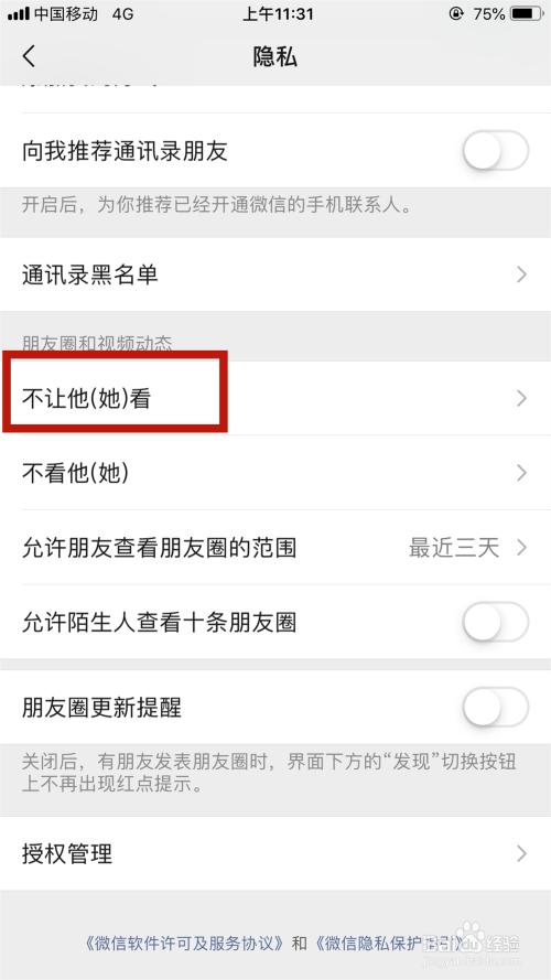 点击“朋友圈和视频动态”的“不让他(她)看”