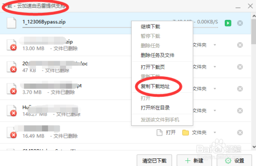 在弹出的下载界面,我们可以看到下载的文件,暂停下载,右键点击该文件,点击复制下载地址,打开我们的迅雷下载软件,粘贴链接起头下载。