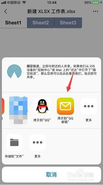 打开用其他应用打开之后页面就会显示分享应用选择,点击选择拷贝到QQ邮箱,如下图