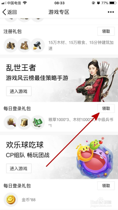 在打开的游戏专区页面中找到乱宿世王者游戏,然后点击“领取”,如下图