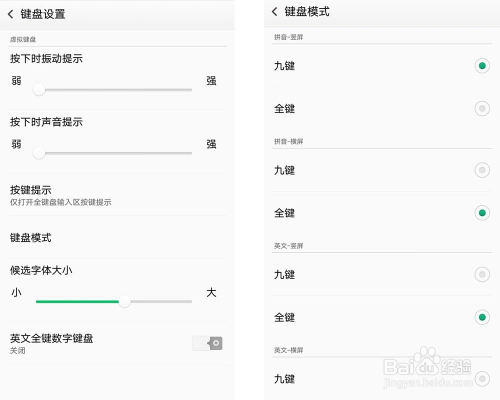 键盘设置可以封闭每次输入会词时会振动,及键盘模式是九宫格和全键盘拼音和英文输入设置