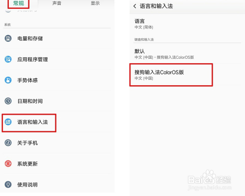 打开“设置“在“常规”找到“说话与输入法中”点击搜狗输入法ColorOS版