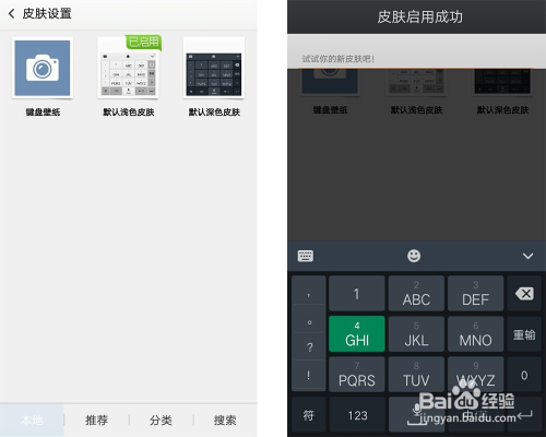 也可以点击键盘壁纸,在相册或摄影照片,作为皮肤里选择图片可以进行裁剪及按键样式选择,布景和字体颜色,可以预览结果,然后感觉可以的话,点击“”确定”就可以启用本身自定的皮肤了