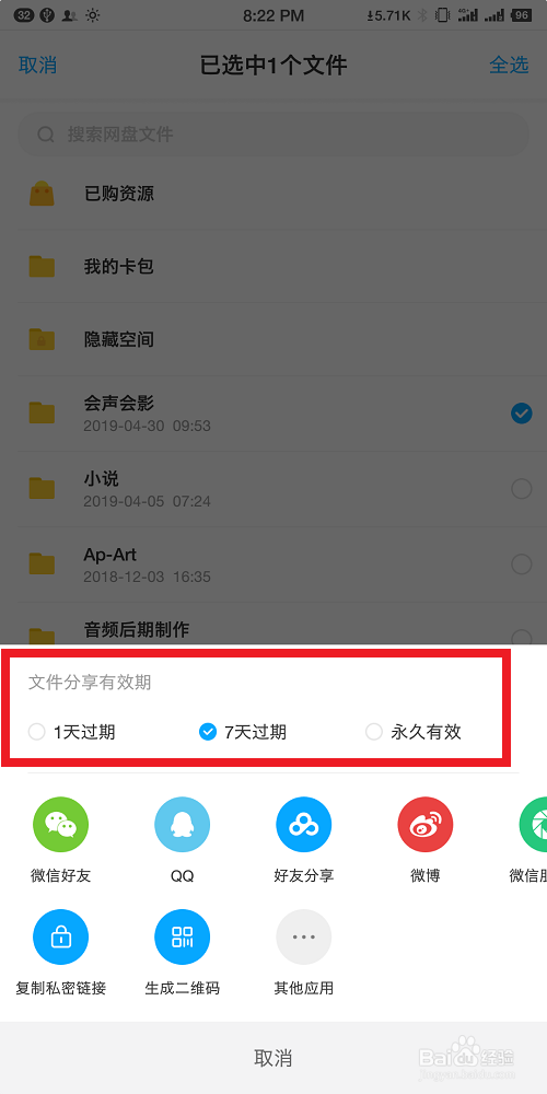 点击了分享之后,我们可以看到跳出了一个选项框。我们首先进行文件分享的有用期的选择。