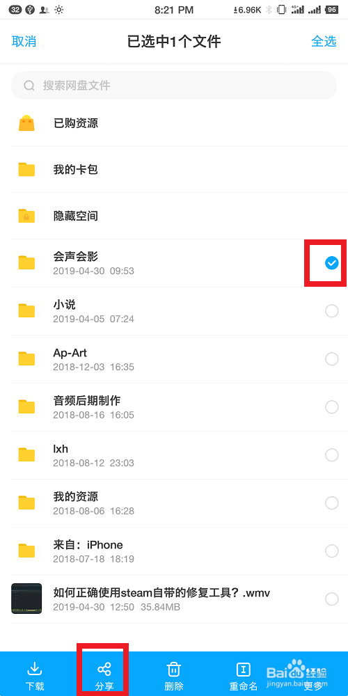 找到后,我们点击那个文件,给它的后面打上一个勾,然后,点击下方的分享按键。