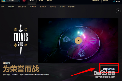 然后在打开的试炼2019为荣耀而战的界面,点击选择你的分院,如图所示。