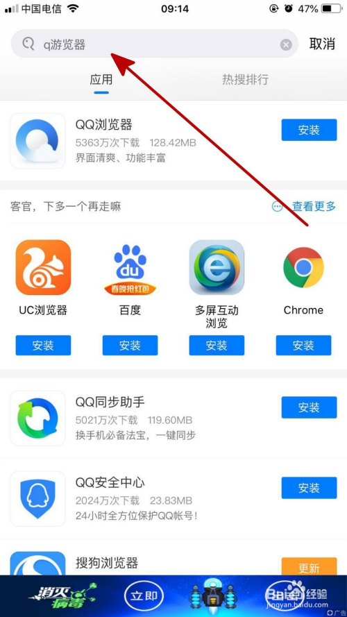 打开后在收搜框输入“QQ游览器”进行搜刮,然后点击搜刮到的QQ游览器打开,在这里必然不要点击“安装”两个字。如下图