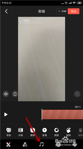 在视频的编纂界面中点击底部的分类 【音乐】,如图所示。