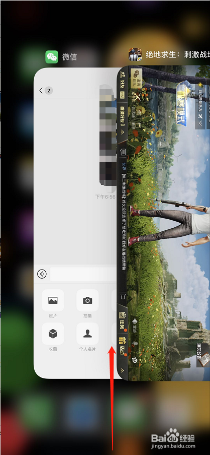 滑到屏幕中心不要搁浅,就会返回桌面,此时吃鸡游戏程序并没有封闭;