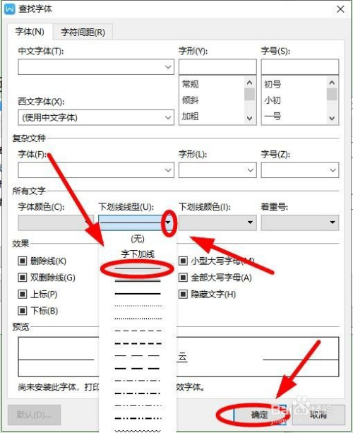 在“查找字体”对话框中的“字体”选项卡,选择“下划线线型”下拉菜单中的第一种,选中后单击“确定”