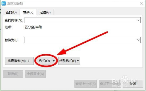 在“查找和替代”对话框中,“替代为”输入框中单击后,找到“格局”单击。同样鄙人拉菜单选择“字体”单击