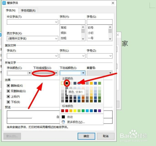 “下划线线型”下拉菜单中的第一种,“下划线颜色”选择“黑色”。选中后单击“确定”