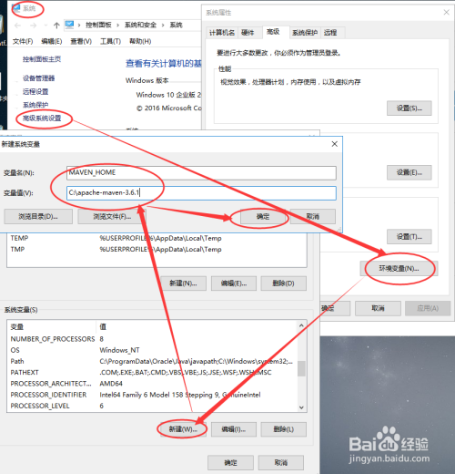 右键我的电脑,选择“属性”->“高级系统设置”->“情况变量”->“系统变量”->“新建”,新建变量名MAVEN_HOME,变量值C:\apache-maven-3.6.1,最后点击“确定”,如下图所示: