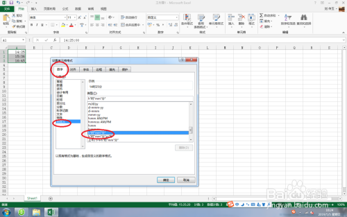 在弹出的信息中,选择【数字】选项卡,在列表中选择自界说,选择显示时分的类型,点击确定,如图。