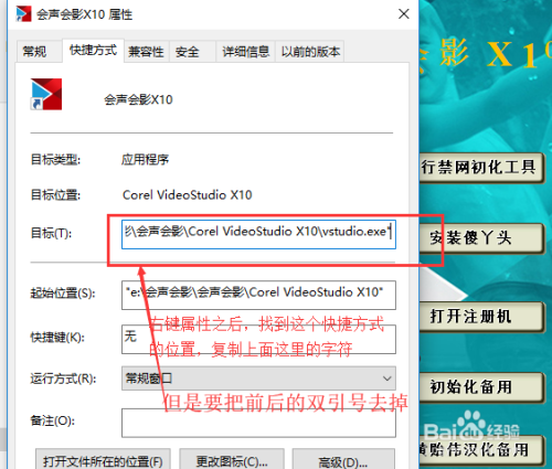 因为之前会声会影在桌面已经有了快捷体例,可以在桌面会声会影的快捷体例,然后右键属性,然后再快捷体例中找到方针,复制此中的字符串(不要前后的双引号)