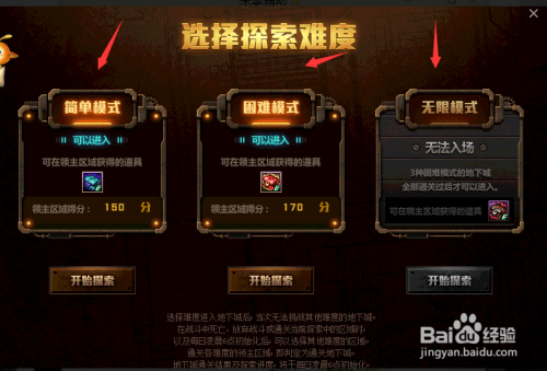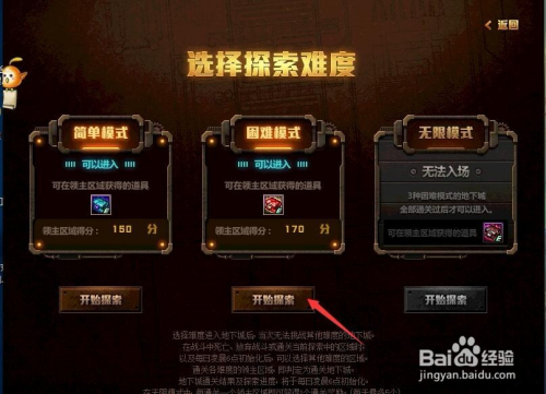 这里我们看到有三种摸索模式,别离为“简单模式”、“坚苦模式”和“无限模式”,此中简单模式和坚苦模式可以直接进入,无限模式是灰色的,上面提醒要通关三种坚苦模式才可解锁无限模式。