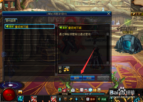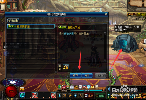 我们点击洞窟,对话弹出“使命”,点开使命并接管。