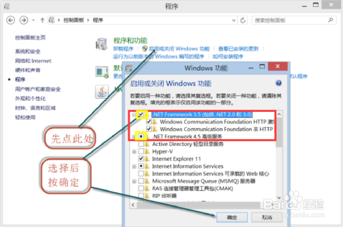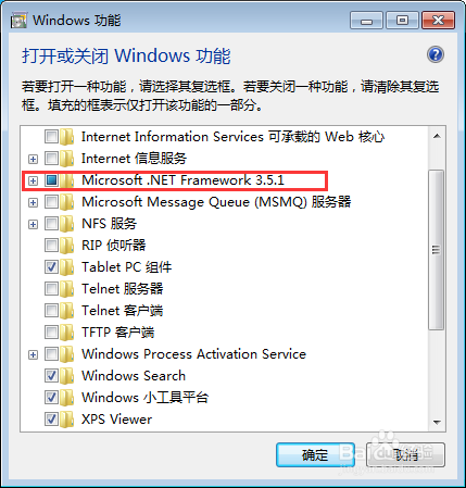 第五步:点选Microsoft .NET Framework功能(WIN7)。WIN10的系统,点选2处。