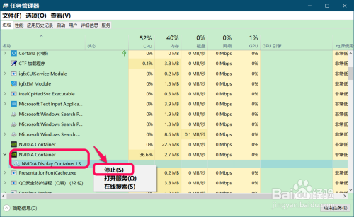 电脑从头启动今后,可能又会呈现 NVIDIA Container 占用CPU利用率高的现象,我们可以在使命办理器中找到并睁开 NVIDIA Container ,右键点击:NVIDIA Display Container LS - 遏制;
