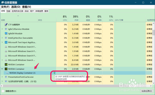 然后我们可以看到 NVIDIA Display Container LS 办事后呈现一个标记:此UWP历程是为改善系统机能罢了经挂起的历程(挂起历程:在操作系统中可以界说为该历程临时被裁减出内存,在机械资本充沛的环境下,又会被操作系统再次调回内存)。