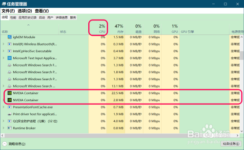 进入使命办理器,我们可以看到:NVIDIA Container 已遏制运行,此时CPU利用率为:5%。
