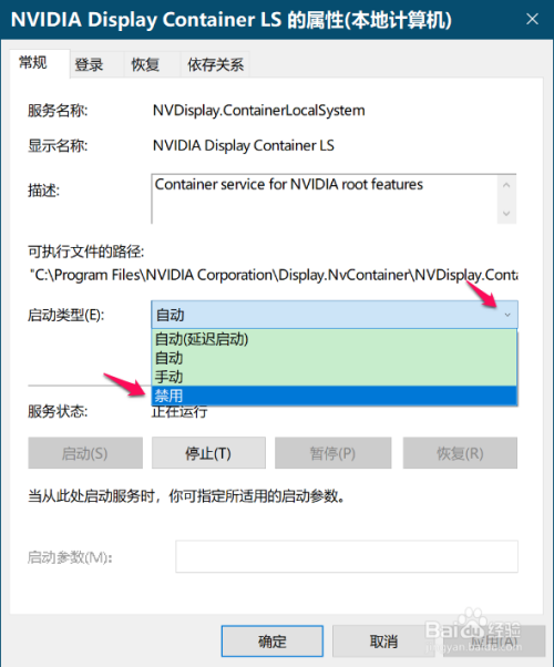 在 NVIDIA Display Container LS 属性窗口中,点击【启动类型】框中的小【√】,鄙人拉菜单中选择【禁用】;