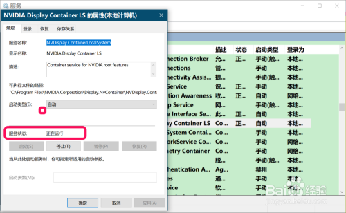 我们再进入当地办事 - NVIDIA Display Container LS 属性窗口中,将启动类型更改为【主动】,办事状况更改为【正在运行】,点击确定并退出当地办事窗口。
