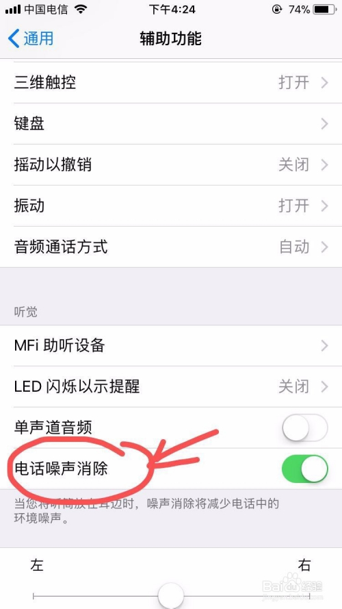 在辅助功能界面滑动屏幕到下面找到德律风噪音消弭并封闭后面的按钮就可以了。