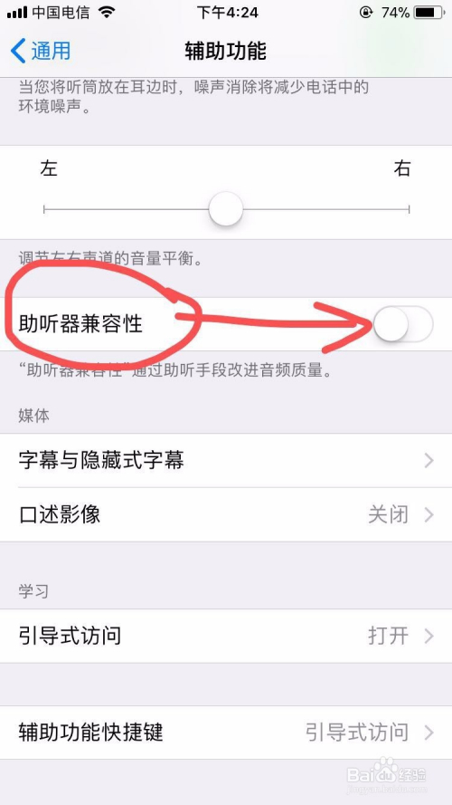 若仍是没有用果的话我们可以在辅助功能里面找到助听器兼容性并打开后面的按钮在听听声音;
