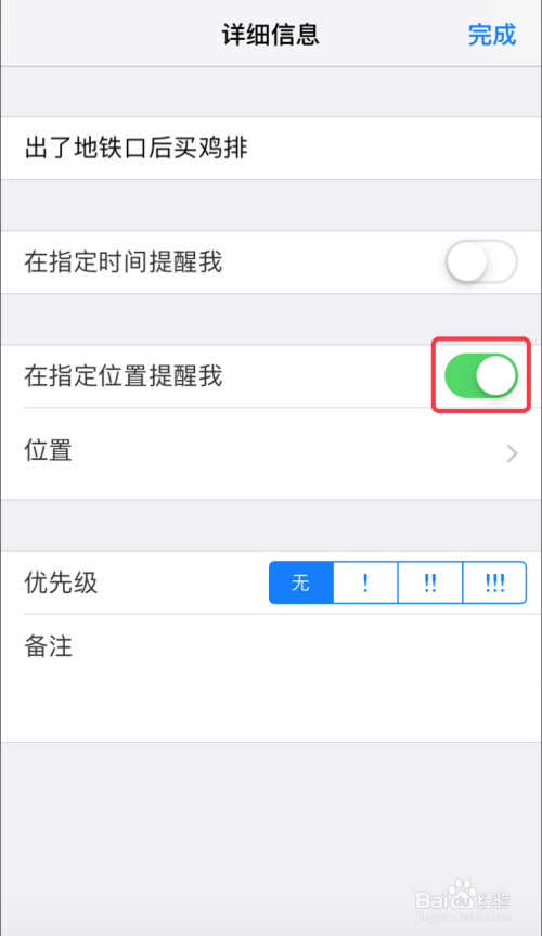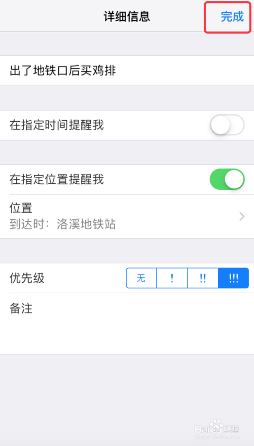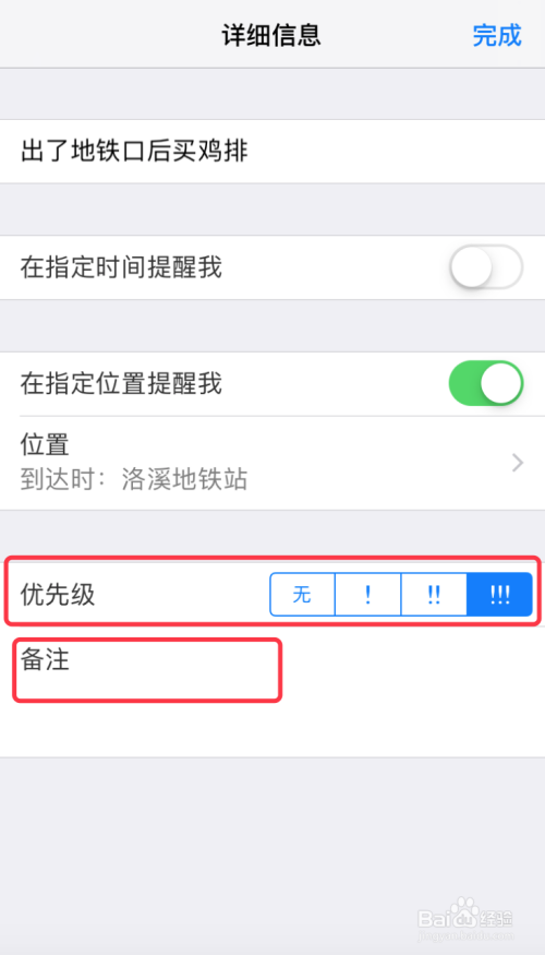 提醒位置设置当作功后,还可以按照需要设置优先级和添加备注,如下图: