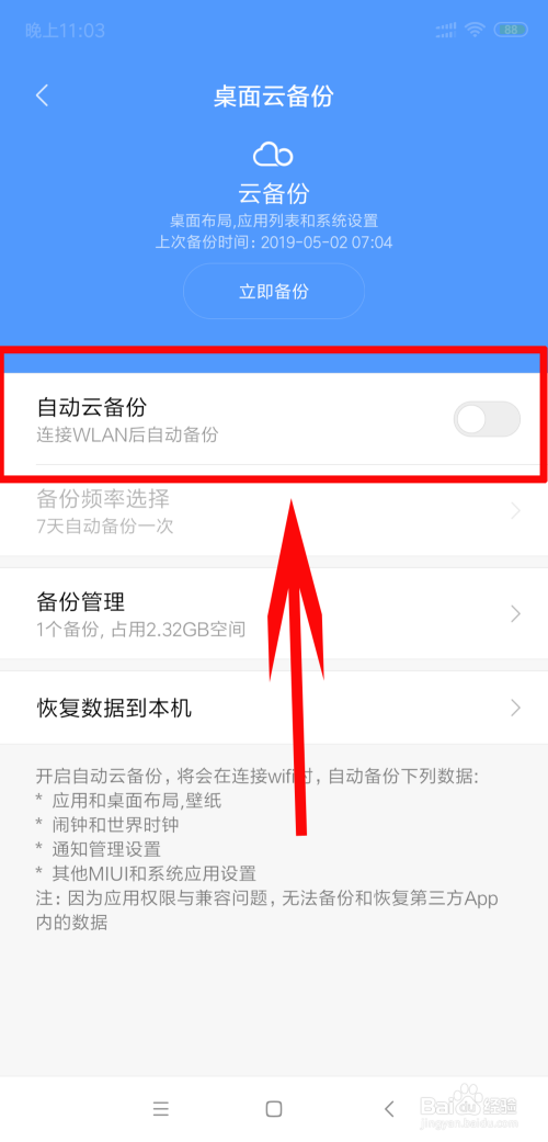 有的时辰,我们利用小米手机得时辰,可能会莫名提醒正在桌面云备份,这里我就教大师如何封闭桌面云备份